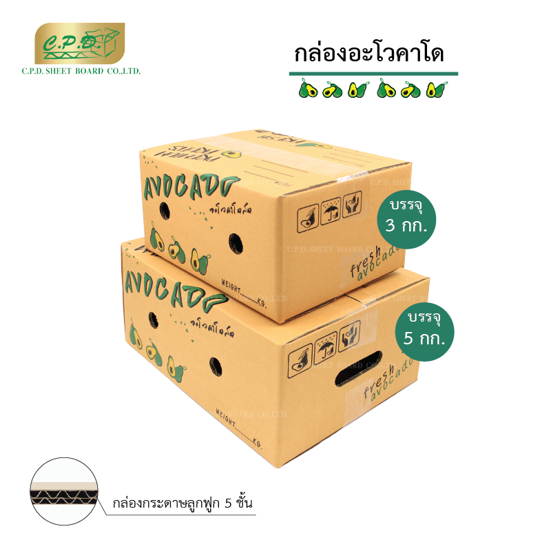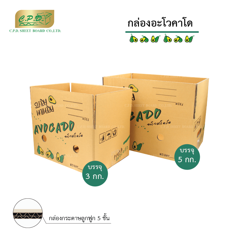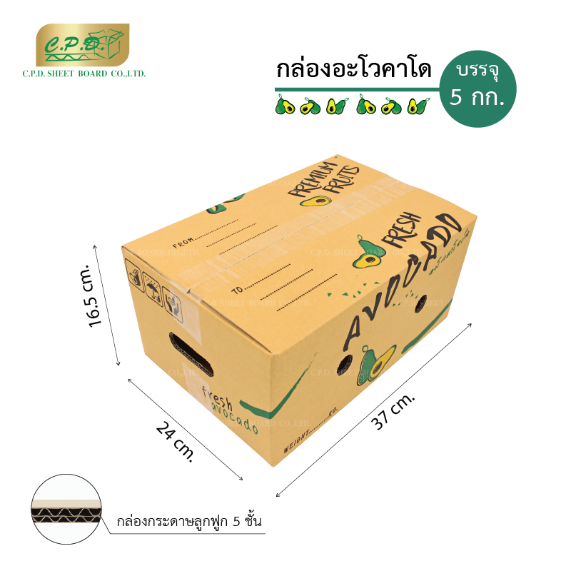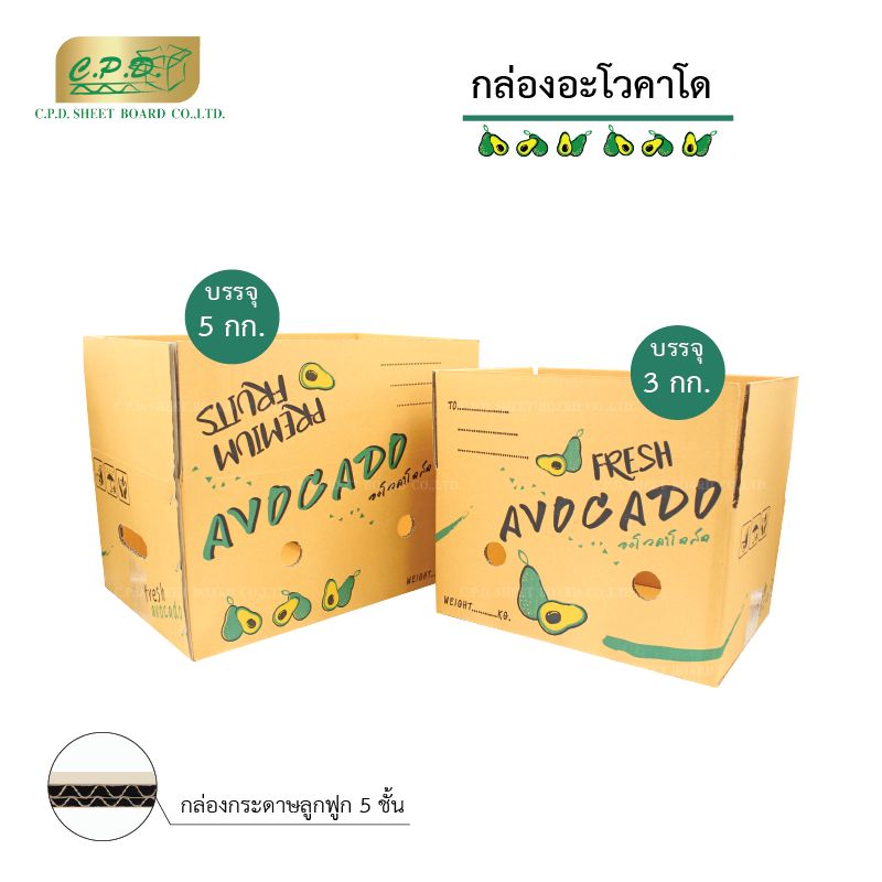 กล่องอะโวคาโด้ 5 กก. 2022 – ขนาด 24 x 37 x 16.5 cm. ( ก x ย x ส) – สั่งซื้อขั้นต่ำ 1 แพ็ค แพ็คละ 20 ใบ – ราคาใบละ 13.90 บาท – ราคานี้เป็นราคาที่รวมภาษีมูลค่าเพิ่ม Vat 7% แล้ว – ราคานี้ยังไม่รวมค่าจัดส่ง